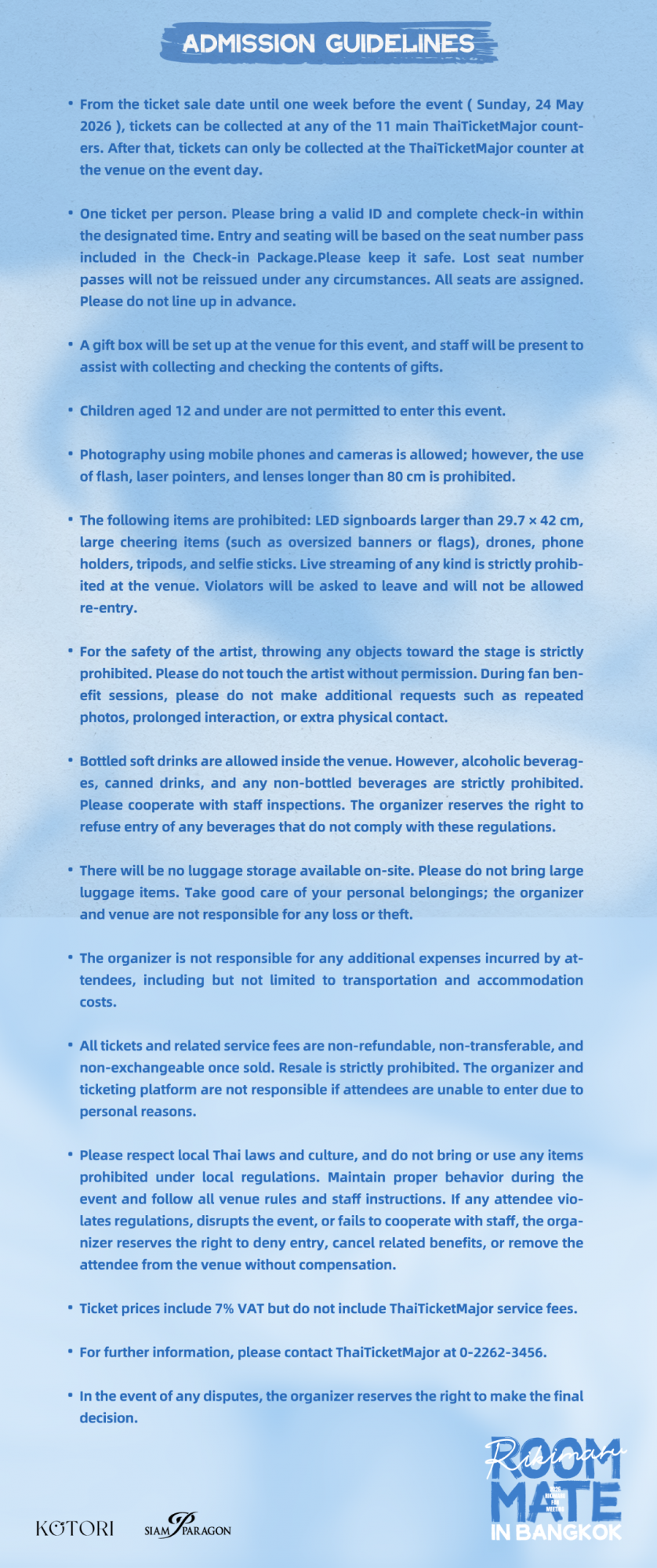 6. การซื้อบัตรเข้าชมคอนเสิร์ตถือเป็นการยอมรับในข้อตกลงและเงื่อนไขทั้งหมดที่บริษัทฯ กำหนดไว้