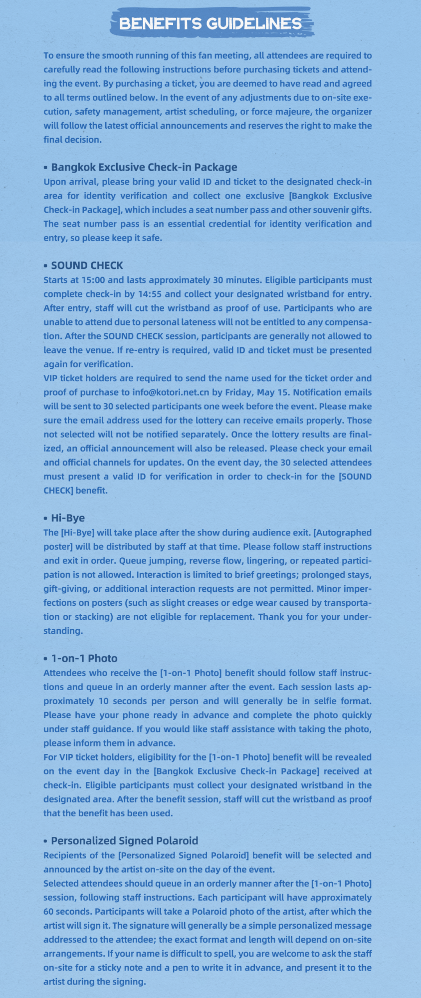 5. การเข้าร่วม Sound Check Viewing, กิจกรรมถ่ายภาพ 1:1 และ Hi-Bye จำกัดสิทธิ์ 1 คน ต่อ 1 สิทธิ์ ต่อ 1 รอบการแสดง แม้ว่าจะซื้อบัตรมากกว่า 1 ใบ จะได้รับสิทธิ์เพียง 1 สิทธิ์เท่านั้น