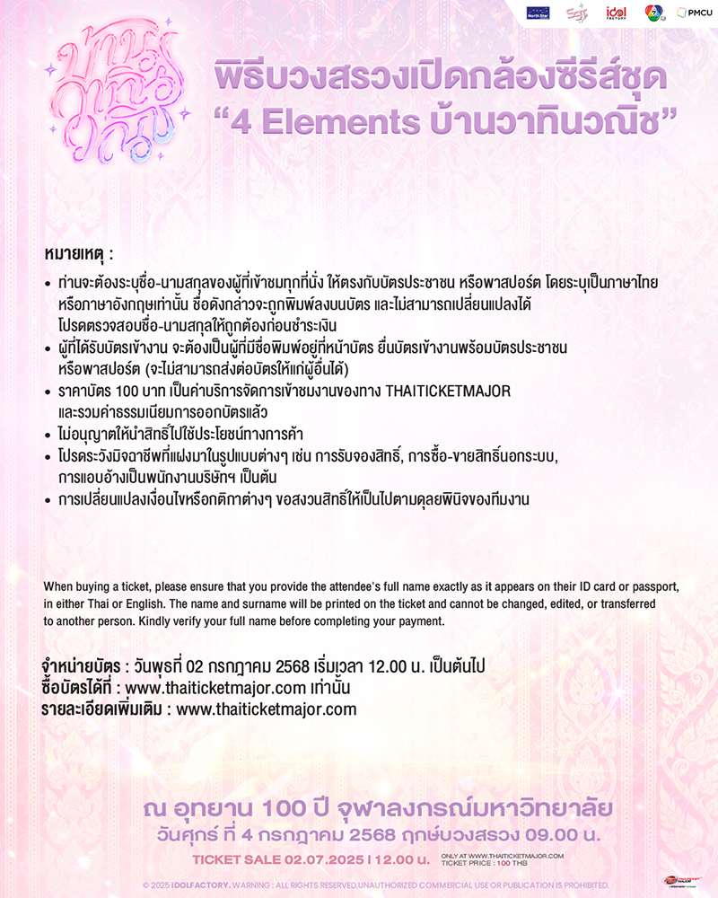 - เมื่อซื้อบัตร ท่านจะต้องระบุชื่อ-นามสกุลที่ตรงกับบัตรประชาชนหรือหนังสือเดินทางของผู้ที่เข้าร่วมงาน โดยระบุเป็นภาษาไทยหรือภาษาอังกฤษเท่านั้น ชื่อและนามสกุลดังกล่าวจะถูกพิมลงบัตรเข้าร่วมงาน ไม่สามารถเปลี่ยนแปลง แก้ไขหรือโอน/มอบอำนาจให้ผู้อื่นได้ โปรดตรวจสอบชื่อ-นามสกุลให้ถูกต้องก่อนชำระเงิน