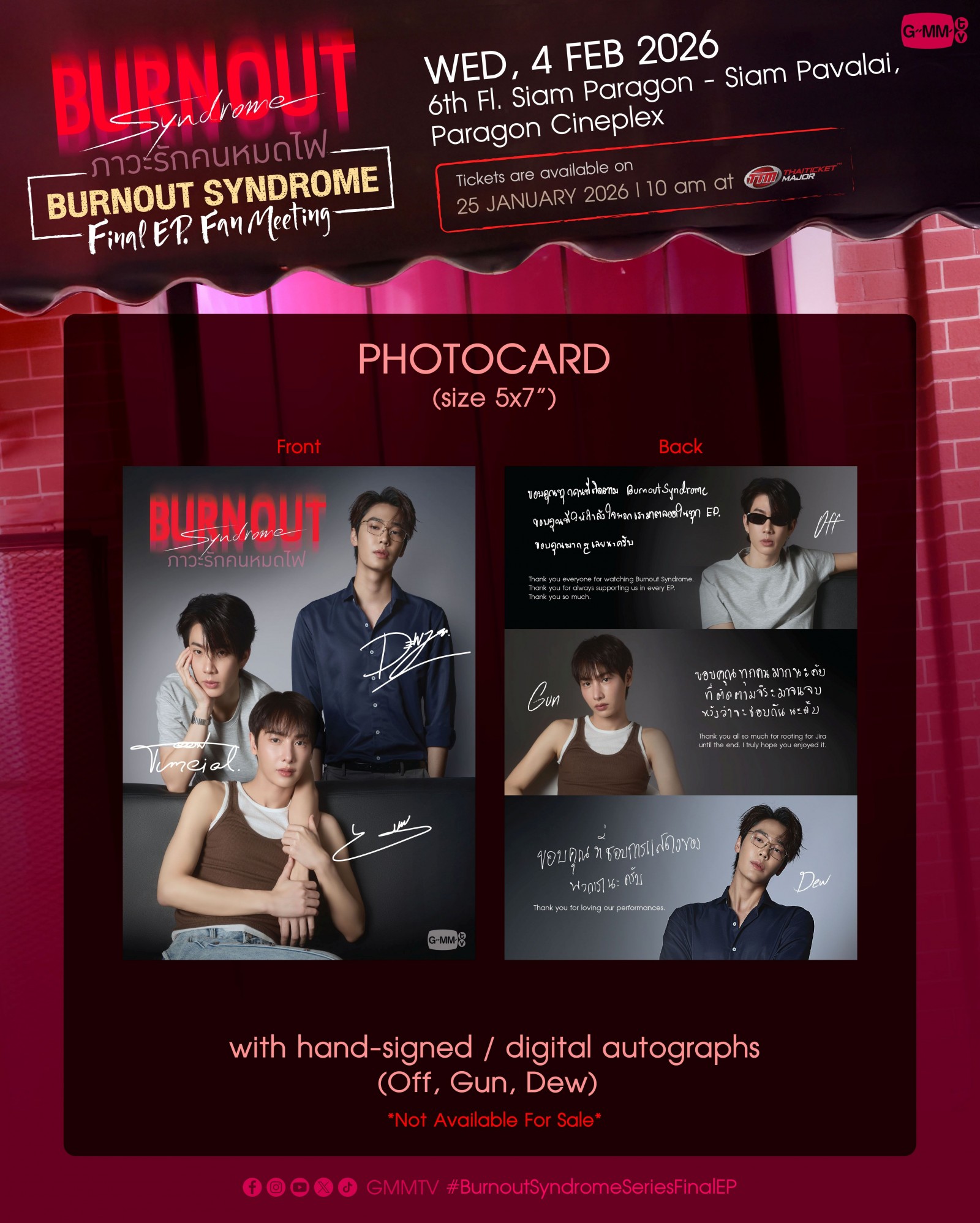 2. Burnout Syndrome Photocard พร้อมลายเซ็นจริงของศิลปิน และ Photocard แบบ digital autographs จะรับกับเจ้าหน้าที่ ณ จุดลงทะเบียนที่หน้างาน