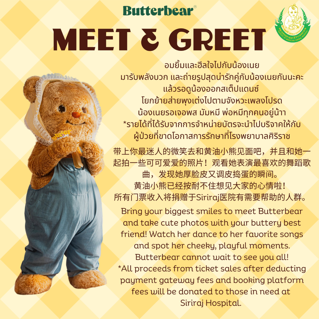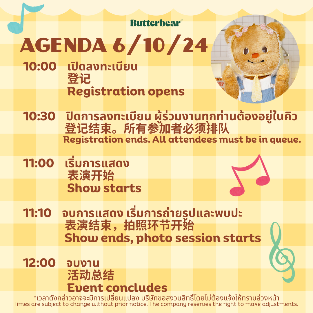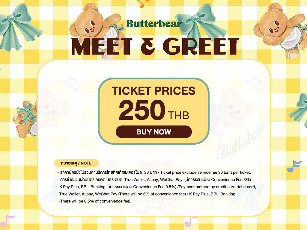 * เมื่อชำระเงินเสร็จสิ้น ท่านจะได้รับ E-Ticket ผ่านทางอีเมลที่ใช้สั่งซื้อ หรือสามารถตรวจสอบได้ที่หน้าเว็บไซต์ เมนูสมาชิก “ตั๋วของฉัน” พร้อมหมายเลขที่เรียงตามลำดับการชำระเงิน ซึ่งทางผู้จัดงานจะนำหมายเลขนี้มาใช้จัดลำดับการถ่ายภาพ โดยลำดับที่ 1-60 จะถูกประกาศผ่าน Instagram, X และ Xiaohongshu ของบัตเตอร์แบร์ออฟฟิเชียลอย่างน้อย 1 วันก่อนวันงาน