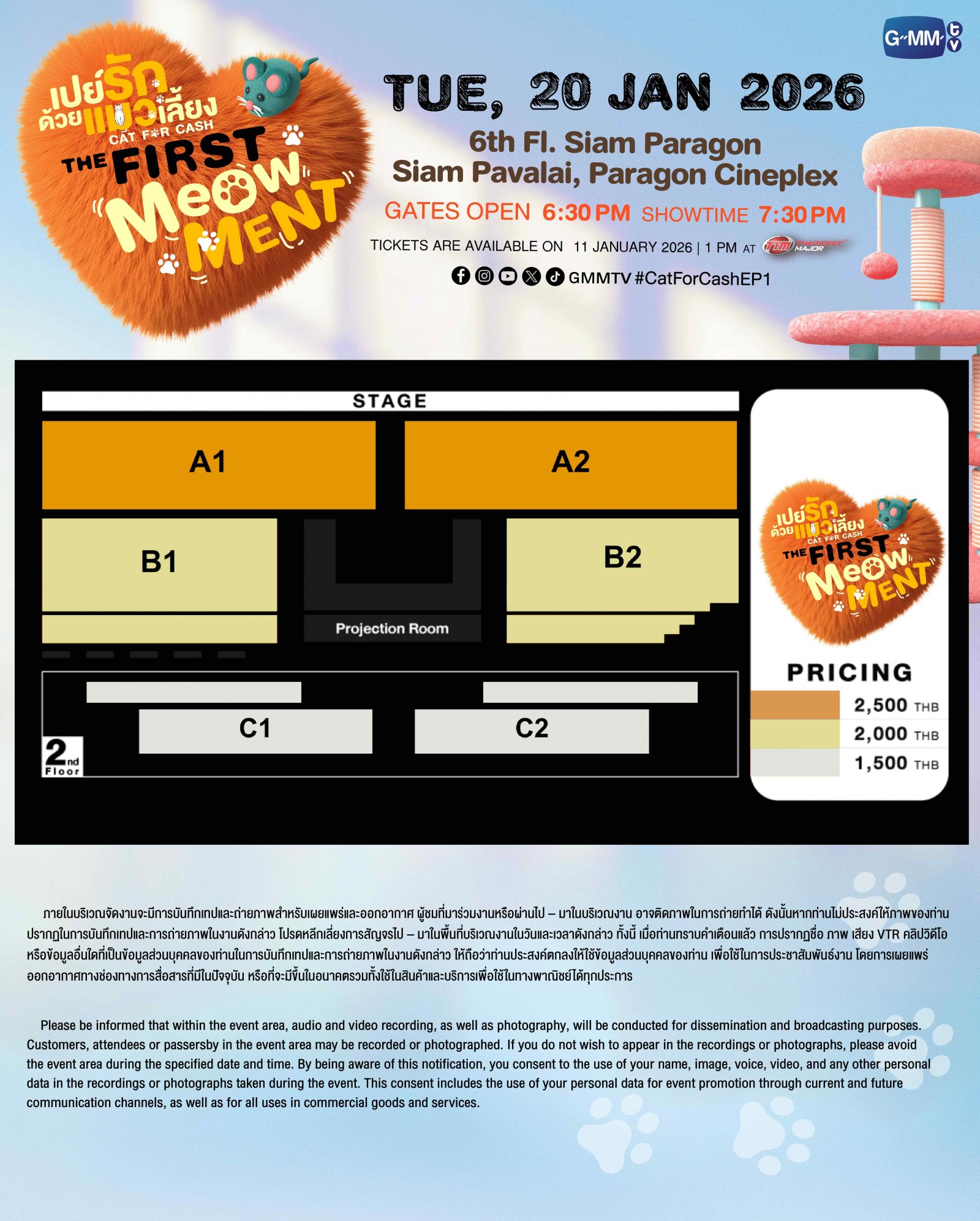 11. ภายในบริเวณจัดงานจะมีการบันทึกเทปและถ่ายภาพสำหรับเผยแพร่และออกอากาศ ผู้ชมที่มาร่วมงานหรือผ่านไป – มาในบริเวณงาน อาจติดภาพในการถ่ายทำได้ ดังนั้นหากท่านไม่ประสงค์ให้ภาพของท่านปรากฏในการบันทึกเทปและการถ่ายภาพในงานดังกล่าว โปรดหลีกเลี่ยงการสัญจรไป – มาในพื้นที่บริเวณงานในวันและเวลาดังกล่าว ทั้งนี้ เมื่อท่านทราบคำเตือนแล้ว การปรากฏชื่อ ภาพ เสียง VTR คลิปวิดีโอ หรือข้อมูลอื่นใดที่เป็นข้อมูลส่วนบุคคลของท่าน ในการบันทึกเทปและการถ่ายภาพในงานดังกล่าว ให้ถือว่าท่านประสงค์ตกลงให้ใช้ข้อมูลส่วนบุคคลของท่าน เพื่อใช้ในการประชาสัมพันธ์งาน โดยการเผยแพร่ออกอากาศทางช่องทางการสื่อสารที่มีในปัจจุบัน หรือที่จะมีขึ้นในอนาคต รวมทั้งใช้ในสินค้าและบริการเพื่อใช้ในทางพาณิชย์ได้ทุกประการ