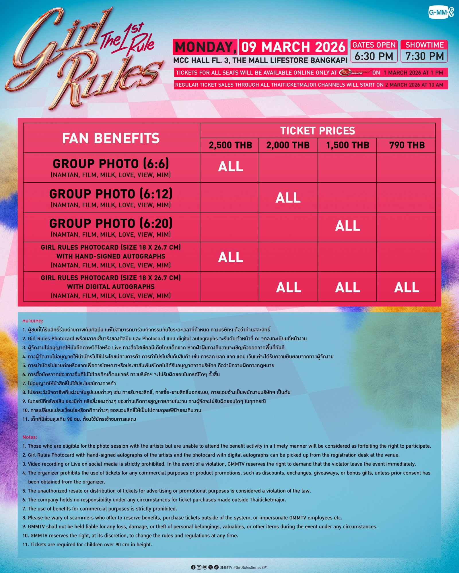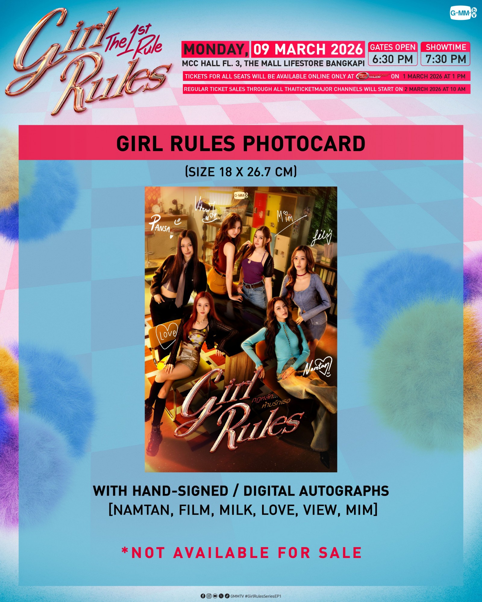2 Girl Rules Photocard พร้อมลายเซ็นจริงของศิลปิน และ Photocard แบบ digital autographs จะรับกับเจ้าหน้าที่ ณ จุดลงทะเบียนที่หน้างาน