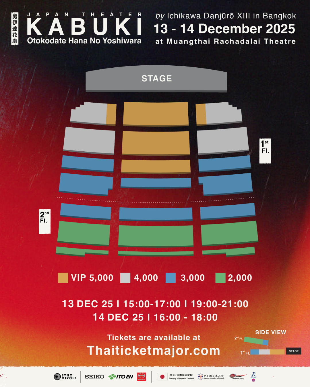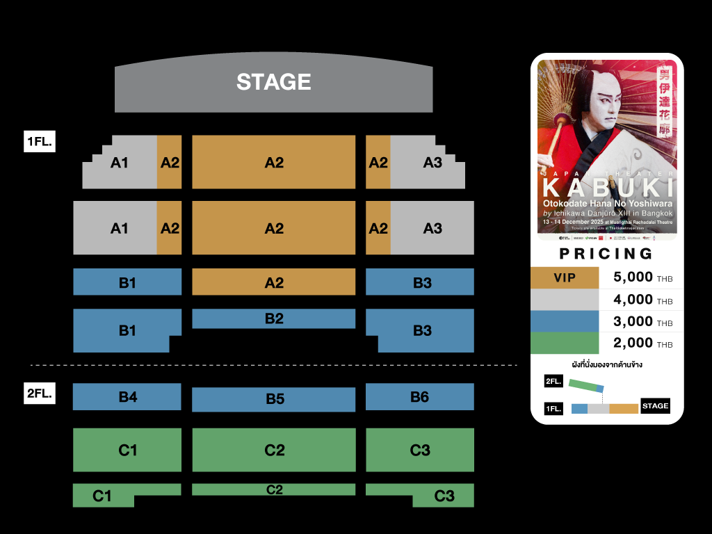 ผู้สนใจสามารถจับจองบัตรเข้าชมการแสดง “KABUKI Otokodate Hana No Yoshiwara by Ichikawa Danjuro XIII in Bangkok 2025” เปิดจำหน่ายบัตรวันแรก ตั้งแต่วันที่ 6 กันยายน 2025 เป็นต้นไป