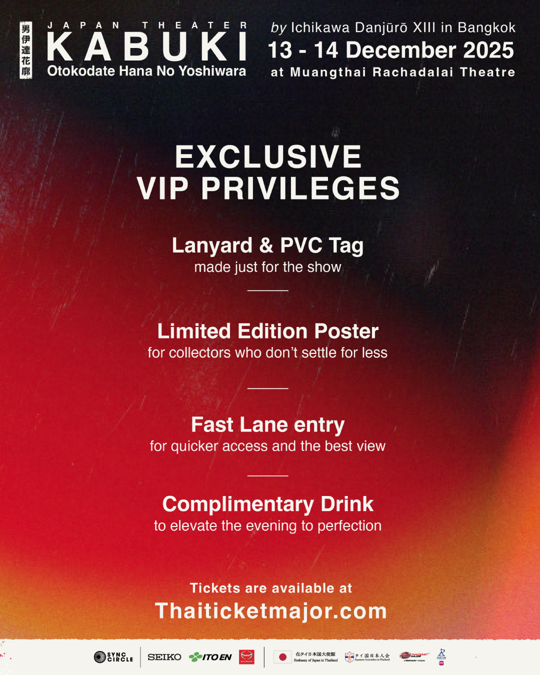 โอกาสที่ไม่ควรพลาด สำหรับผู้ที่ต้องการสัมผัสมนต์เสน่ห์แห่งคาบูกิอย่างใกล้ชิดในบรรยากาศสุดพรีเมียม บัตร VIP ราคา 5,000 บาท (จำนวนจำกัด) มอบสิทธิพิเศษเหนือระดับ ทั้งสายคล้องและแท็ก PVC รุ่นลิมิเต็ด โปสเตอร์เวอร์ชันพิเศษ ที่นั่งคุณภาพเยี่ยมพร้อมสิทธิ์เข้าชมก่อนใคร ตลอดจนเครื่องดื่มเอ็กซ์คลูซีฟที่จะเติมเต็มค่ำคืนอันน่าจดจำให้สมบูรณ์แบบอย่างแท้จริง