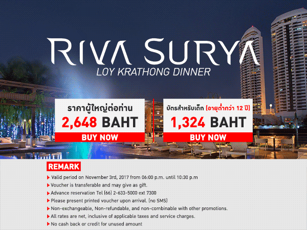 โรงแรม ริวา เซอร์ยา กรุงเทพฯ มีความยินดีที่จะเชิญทุกท่านมาร่วมกิจกรรม ลอยกระทงริมแม่น้ำเจ้าพระยา โดยมีรายละเอียด ดังนี้