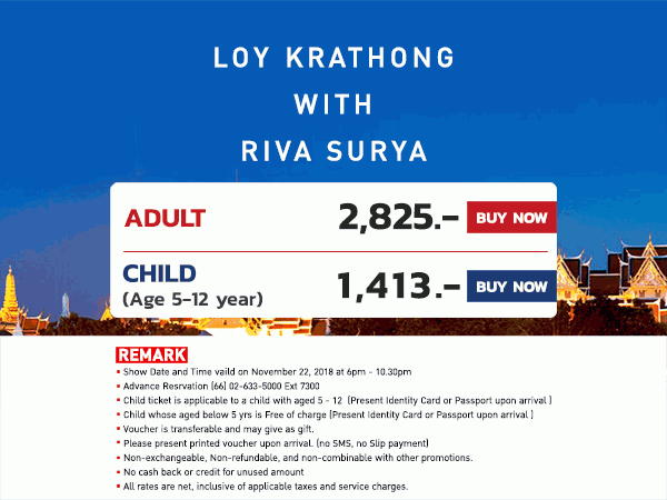 โรงแรม ริวา เซอร์ยา กรุงเทพฯ มีความยินดีที่จะเชิญทุกท่านมาร่วมกิจกรรม ลอยกระทงริมแม่น้ำเจ้าพระยา โดยมีรายละเอียด ดังนี้