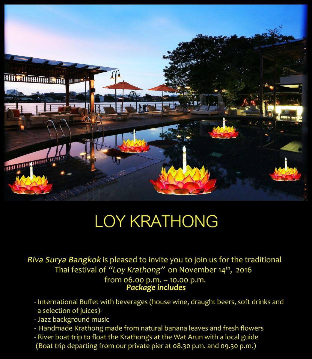 - ลงเรือไปลอยกระทงหน้าพระปรางค์วัดอรุณอันสวยงาม (เรือจะออกจากท่าเรือส่วนตัวของทางโรงแรม 2 รอบ คือเวลา 20.30 น. และเวลา 21.30 น.)
