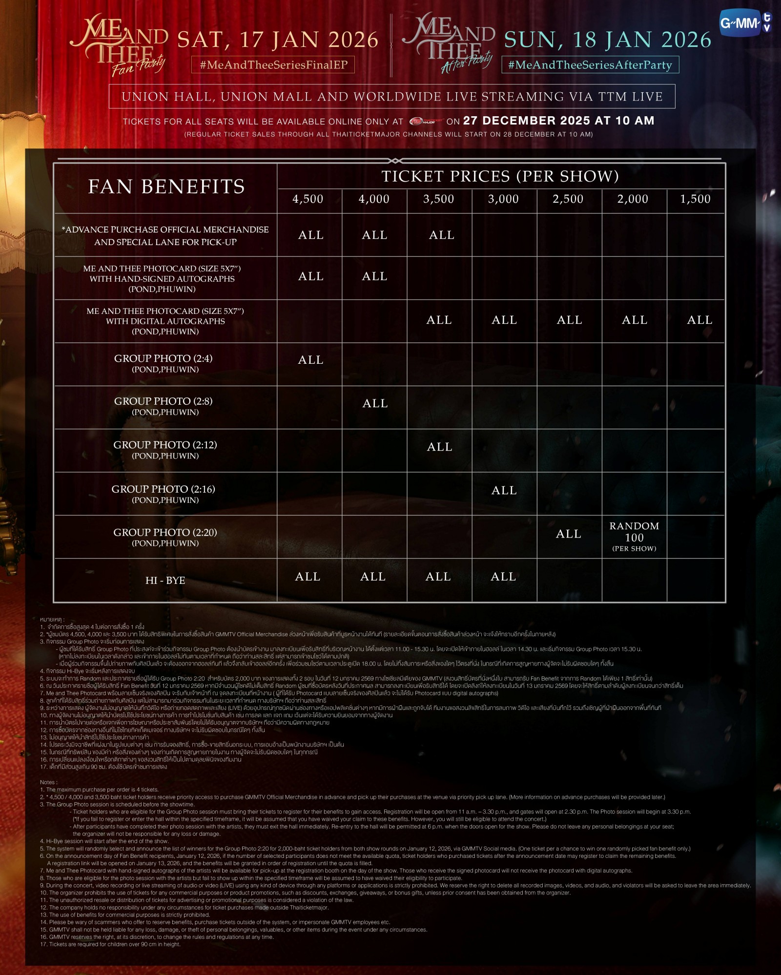 5. ระบบจะทำการ Random และประกาศรายชื่อผู้ได้รับ Group Photo 2:20 สำหรับบัตร 2,000 บาท ของการแสดงทั้ง 2 รอบ ในวันที่ 12 มกราคม 2569 ทางโซเชียลมีเดียของ GMMTV (สงวนสิทธิ์บัตรที่นั่งหนึ่งใบ สามารถรับ Fan Benefit จากการ Random ได้เพียง 1 สิทธิ์เท่านั้น)