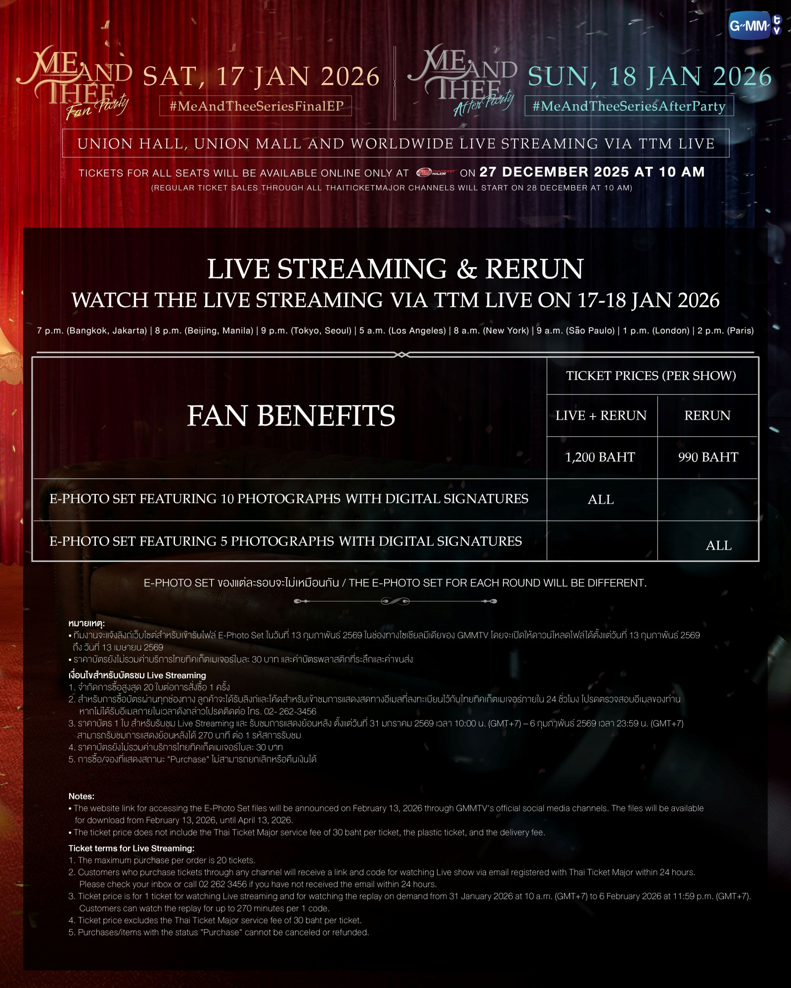 - ทีมงานจะแจ้งลิงก์เว็บไซต์สำหรับเข้ารับไฟล์ E-Photo Set ในวันที่ 13 กุมภาพันธ์ 2569 ในช่องทางโซเชียลมีเดียของ GMMTV โดยจะเปิดให้ดาวน์โหลดไฟล์ได้ตั้งแต่วันที่ 13 กุมภาพันธ์ 2569 ถึง วันที่ 13 เมษายน 2569