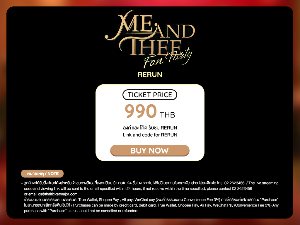 2. สำหรับการซื้อบัตรผ่านทุกช่องทาง ลูกค้าจะได้รับลิงก์และโค้ดสำหรับเข้าชมการแสดงสดทางอีเมลที่ลงทะเบียนไว้กับไทยทิคเก็ตเมเจอร์ภายใน 24 ชั่วโมง โปรดตรวจสอบอีเมลของท่าน หากไม่ได้รับอีเมลภายในเวลาดังกล่าวโปรดติดต่อ โทร. 02- 262-3456