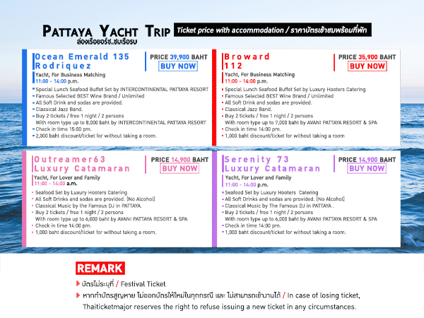 - เมื่อซื้อบัตรเรือ Ocean Emerald – Rodriquez รอบเวลา 18.00 – 21.00 น. ราคา 35,000 บาท จำนวน 2 ใบ จะได้รับสิทธิพิเศษเข้าพักที่ INTERCONTINENTAL PATTAYA RESORT มูลค่า 8,000 บาท เวลาเช็คอิน บ่าย 3 โมง ของวันที่ซื้อบัตร (ที่พัก 1 คืน เข้าพักได้สูงสุด 2 ท่าน รวมอาหารเช้า) โดยลูกค้าสามารถนำบัตรชมเรือ พร้อมบัตรประชาชน หรือ พาสปอร์ต เข้าเช็คอินที่โรงแรม