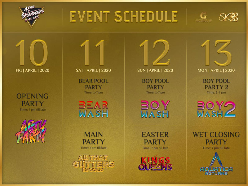 | วันอาทิตย์ที่ 12 เมษายน 2563 | 13:00 - 19:00 น. | Boy 1 Pool Party | Novotel Bangkok Sukhumvit 4 |