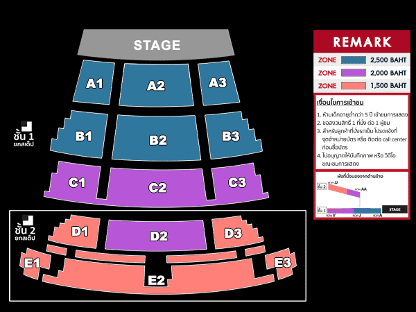 - ห้ามเด็กอายุต่ำกว่า 5 ปี เข้าชมการแสดง สำหรับลูกค้าที่จะพาเด็กมาชมการแสดง จะต้องซื้อตั๋ว 1 ที่นั่งให้สำหรับเด็ก