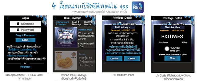 1. สมาชิกฯ กดรับสิทธิ์ใช้คะแนนสะสม Blue Points 300 คะแนน แลกรับโค้ดส่วนลด 200 บาท ผ่านทาง PTT Blue Card Mobile Application ตามขั้นตอนที่ระบุ