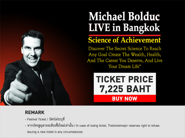 Michael Bolduc has coached thousands of people to set and achieve their goals with a 99% success rate. Michael charges $100,000 USD per year for one-on-one coaching. But for a small investment you can get coaching from Michael in his 1-day science of achievement seminar. Michael will teach you the ultimate success formula for setting and achieving goals, designed to help you turn your dreams into reality. Master Success Coach Michael Bolduc will show you the new psychology of achievement to unlock your full potential, tap into your personal power to attract the life you’ve always wanted. Michael will show you how to have the best year of your life by doubling your income, find your dream partner, lose excess weight, and much much more. The moment you discover the secret psychology of success, your confidence will immediately increase, and you’ll harness the power to transform your life. This special one-day class is open to the public and will be held on December 19, 2015, from 09:00 a.m. until 5:30 p.m., Bangkok by AIM inlines, AIM Training Co., Ltd. (www.aiminlines.co.th) or call for more info Tel: 02-513-0123 – 085-1313-835 – 086-810-4434 |