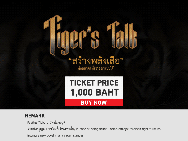 พบกับ “Tiger Talk” ได้ในวันเสาร์ที่ 22 สิงหาคม 2558 ณ หอดนตรีและการแสดงอโศกมนตรี 1 ศูนย์ศิลปกรรมแห่งประเทศไทย อาคารนวัตกรรม มหาวิทยาลัยศรีนครินทรวิโรฒ ถนนสุขุมวิท 21 หรือ 23 จำนวน 2 รอบ เวลา 10.00 น. และ 15.00 น. บัตรราคาใบละ 1,000 บาท (รายได้หลังหักค่าใช้จ่ายส่วนหนึ่งมอบให้มูลนิธีเพื่อเด็กพิการ เป็นการกุศล) ซื้อบัตรได้ที่ ไทยทิคเก็ตเมเจอร์ทุกสาขา www.thaiticketmajor.com และ โทร 02-2623456 เชิญมาปลุกพลังเสือ พลังบวกด้วยกัน