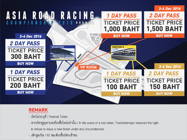- สำหรับผู้ที่มีบัตรเข้าชมการแข่งขันเอเชีย โร้ด เรซซิ่ง แชมป์เปี้ยนชิพ2016 สนามที่ 6 สามารถเข้าร่วมชมการฝึกซ้อม ในวันศุกร์ที่ 2 ธันวาคม 2559 ณ สนามช้าง อินเตอร์เนชันแนลเซอร์กิตได้