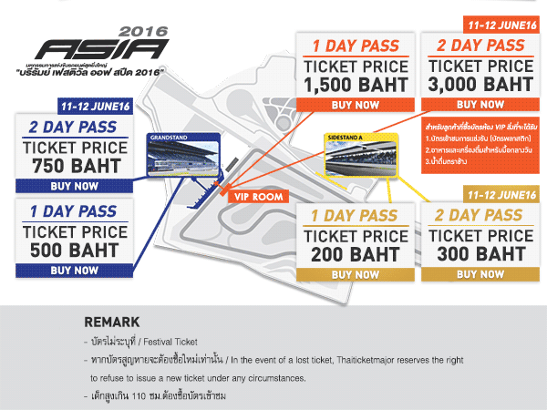 - บัตรเข้าชมห้อง VIP ที่ซื้อจากไทยทิคเก็ตเมเจอร์ลูกค้าต้องนำบัตรมาแลกรับบัตรพลาสติกที่จุดจำหน่ายบัตรหน้าสนามช้าง อินเตอร์เนชั่นแนลเซอร์กิตก่อนเข้าชมการแข่งขัน (ตู้คอนเทนเนอร์ตรงข้าม MEGA STORE)