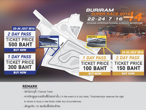 - สำหรับผู้ที่มีบัตรเข้าชมการแข่งขันบุรีรัมย์ ซูเปอร์ เรซ 2016 สามารถเข้าร่วมชมการฝึกซ้อม ในวันศุกร์ที่ 22 กรกฎาคม 2559 ณ สนามช้าง อินเตอร์เนชันแนลเซอร์กิตได้