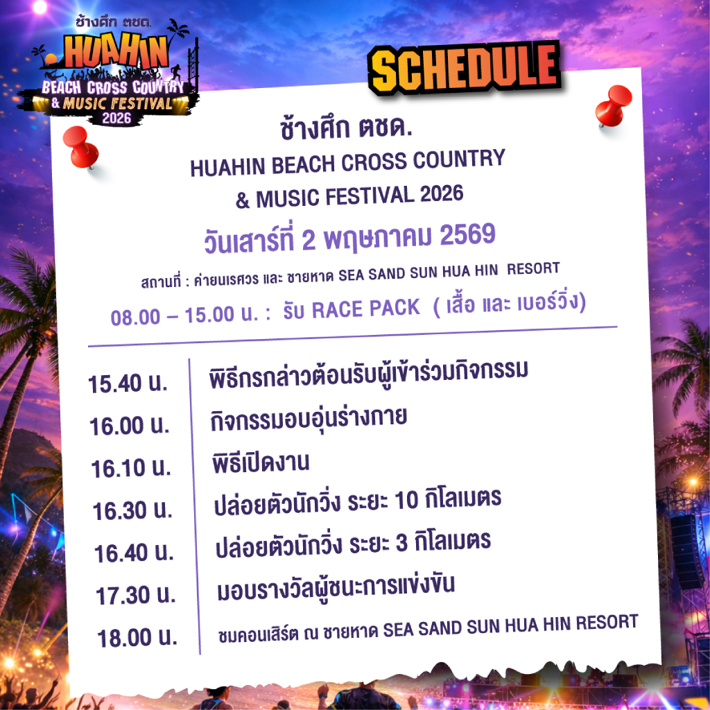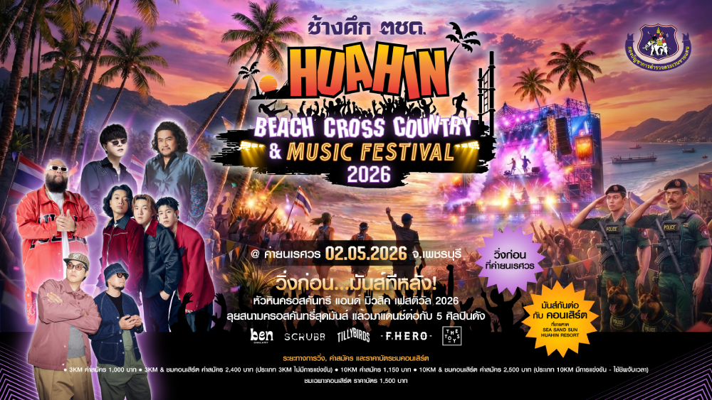 เตรียมแพ็คกระเป๋า มุ่งหน้าสู่งานเทศกาลริมทะเลสุดยิ่งใหญ่แห่งปี "ช้างศึก ตชด. หัวหิน บีช ครอสคันทรี & มิวสิค เฟสติวัล 2026" วันที่ 2 พฤษภาคม 2026 ณ พื้นที่สุดพิเศษของค่ายนเรศวร และชายหาด Sea Sand Sun Hua-Hin Resort นี่คืองานเดียวที่รวมเอากีฬา การท่องเที่ยว และการอนุรักษ์ธรรมชาติมาไว้ด้วยกันอย่างลงตัวที่สุด