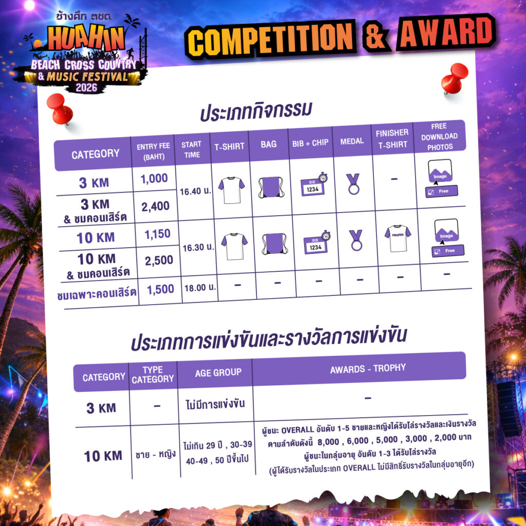 พบกับกิจกรรมที่ตอบโจทย์ทุกคนในครอบครัว! สายสปอร์ตต้องห้ามพลาดการวิ่ง Cross Country ระยะ 10 กิโลเมตร บนเส้นทางป่าและชายหาดที่ท้าทาย และระยะ 3 กิโลเมตรสำหรับสายชิล ส่วนครอบครัวสามารถจูงมือเด็กๆ มาร่วมสนุกกับเครื่องเล่นและเกมล่าสมบัติชายหาด พร้อมเดินช้อปปิ้ง ชิมของอร่อยจากการออกร้านของชุมชน แถมยังได้ชมโชว์สุดเท่จาก ตชด. เช่น SWAT CHALLENGE, การฝึกอุโมงค์ลม และการโดดร่มแจกเหรียญที่ระลึกที่ไม่เคยมีที่ไหนมาก่อน