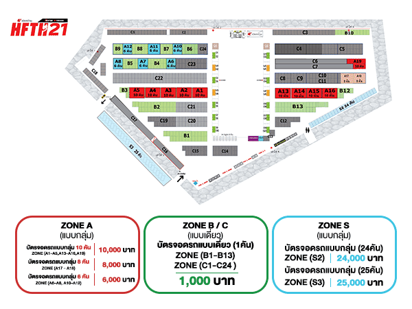 1,000 บาท : Zone B1-B13 และ Zone C1-C24 บัตรจอดแบบเดี่ยว