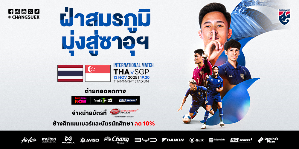 สมาคมกีฬาฟุตบอลแห่งประเทศไทย ในพระบรมราชูปถัมภ์ ประกาศรายชื่อ 23 นักฟุตบอลทีมชาติไทย ชุดทำการแข่งขันฟุตบอลอุ่นเครื่อง International Match พบ สิงคโปร์ วันที่ 13 พฤศจิกายน 2568 และ เอเชียน คัพ 2027 รอบคัดเลือก พบ ศรีลังกา วันที่ 18 พฤศจิกายน 2568