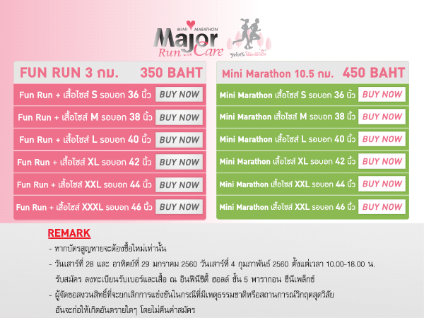 - วิ่งมินิมาราธอน 10.5 กม. ท่านละ 450 บาท รับจำนวน 2,000 คน