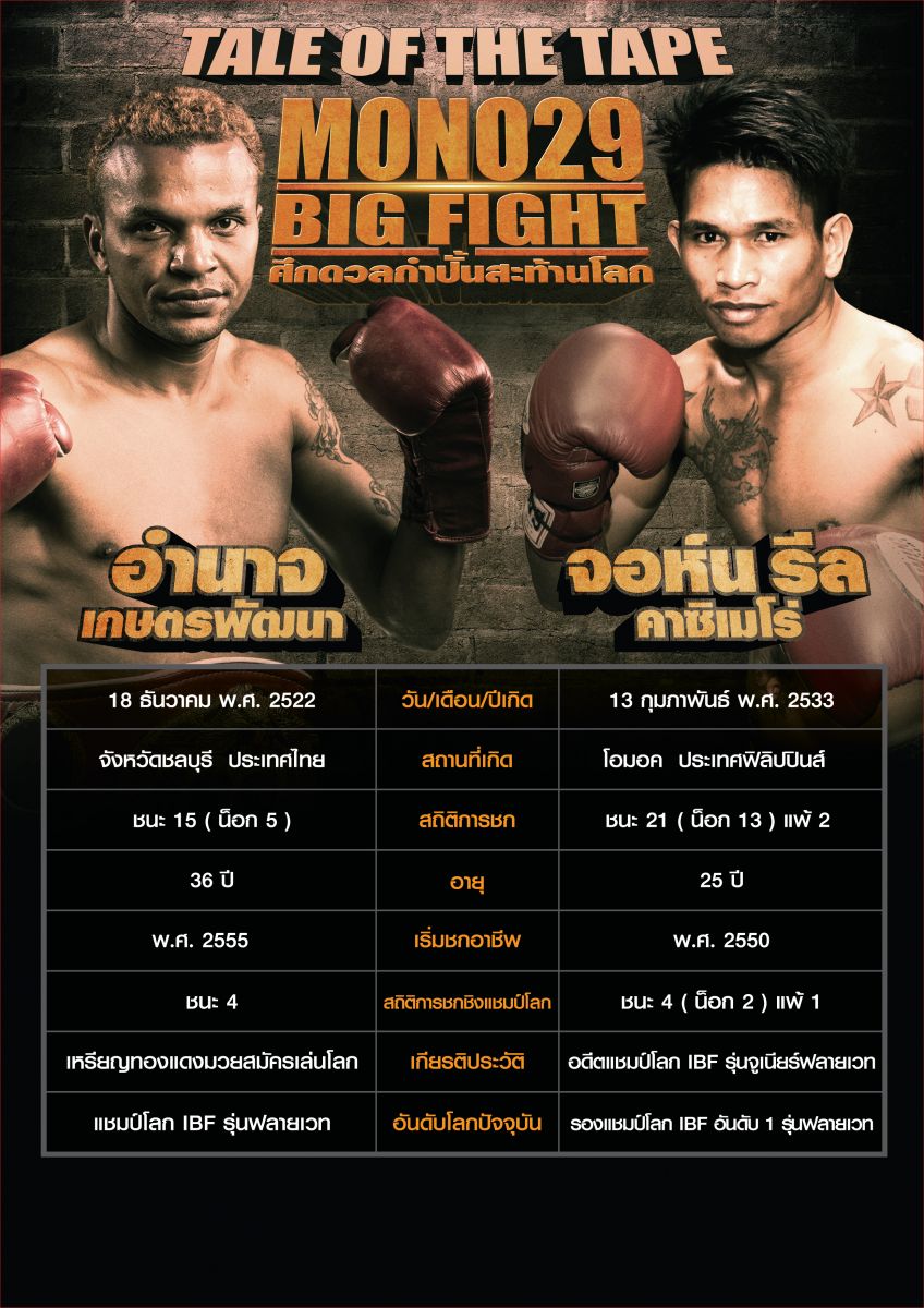 จับมือกับโปรโมเตอร์ดัง “เกียรติกรีรินทร์ โปรโมชั่น” ร่วมสร้างประวัติศาสตร์มวยโลกให้เมืองไทย ด้วยศึกป้องกันตำแหน่งแชมป์โลกครั้งที่ 4 ระหว่าง “อำนาจ เกษตรพัฒนา” นักชกชาวไทย แชมป์โลกสหพันธ์มวยนานาชาติ (IBF) รุ่นฟลายเวท ขี้นเวทีชกป้องกันเข็มขัดแชมป์กับ “จอห์น รีล คาซิเมโร่” รองแชมป์อันดับ1 ชาวฟิลิปปินส์ ในวันเสาร์ที่ 27 มิถุนายน 2558 เวลา 18.00-20.00 น. ที่ อินดอร์ สเตเดี้ยม หัวหมาก โดยทาง MONO29 เตรียมทุ่มงบจัดการแข่งขันเนรมิตเวทีสุดอลังการ ระบบแสง-สี-เสียง และมุมกล้องเทียบชั้นต่างชาติ พร้อมเปิดให้แฟนมวยได้ร่วมชมและเชียร์ ในแบบเต็มอิ่มจุใจ กว่า 2 ชั่วโมงเต็ม ทั้งในสังเวียนอินดอร์ สเตเดี้ยม หัวหมาก และชมผ่านทางช่อง MONO29 ทางช่อง MONO29 ดิจิตอลทีวีช่อง 29,เคเบิลทีวีช่อง 39 หรือ จานดาวเทียม PSI ช่อง 449