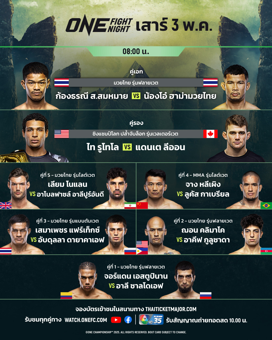 เมื่อ 3 เดือนก่อน "ก้องธรณี" แชมป์โลกมวยไทยเวทีราชดำเนินหลายสมัย สร้างความตกตะลึงให้แฟนมวยทั่วโลก เมื่อเขาเบียดชนะคะแนนไม่เอกฉันท์ "น้องโอ๋" อดีตแชมป์โลก ONE รุ่นแบนตัมเวต ที่ลดรุ่นลงมาสู้ในพิกัดฟลายเวตครั้งแรกกับ ONE ทำให้การเปิดตัวในรุ่นนี้ของนักชกระดับตำนานต้องคว่ำไม่เป็นท่า