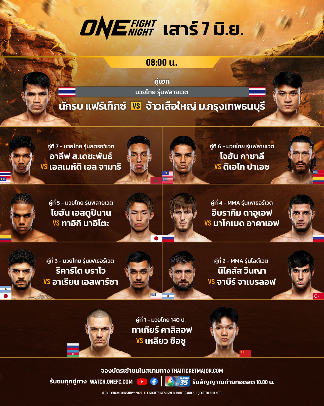เตรียมตัวให้พร้อมสำหรับการแข่งขันศิลปะการต่อสู้สุดเร้าใจในวันเสาร์ที่ 7 มิถุนายนนี้ งานนี้ยกทัพนักสู้ดาวรุ่งจากวงการ MMA และมวยไทยมาประชันฝีมือในศึก ONE Fight Night 32: นักรบ vs จ้าวเสือใหญ่ ถ่ายทอดสดจากสนามมวยเวทีลุมพินี กรุงเทพฯ
