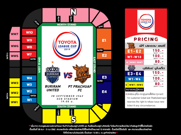 ***เนื่องจาก ทางกฎของสนามมีการกำหนด ทีมเจ้าบ้านต้องอยู่ทางทิศใต้ และ ทีมเยือนต้องอยู่ทางทิศเหนือ จึงต้องทำการปรับผังใหม่ สำหรับลูกค้าที่ซื้อบัตรไปแล้วตั้งแต่วันที่ 28 ส.ค - 3 ก.ย 2562 สามารถติดต่อ เปลี่ยนบัตรเข้าชมได้ที่ไทยทิคเก็ตเมเจอร์ 13 สาขาหลัก ตั้งแต่วันนี้เป็นต้นไป และ สามารถเปลี่ยนบัตรเข้าชมได้ที่หน้าสนามในวันแข่งขัน ตั้งแต่เวลา 12:00 น. ณ บูธจำหน่ายบัตร